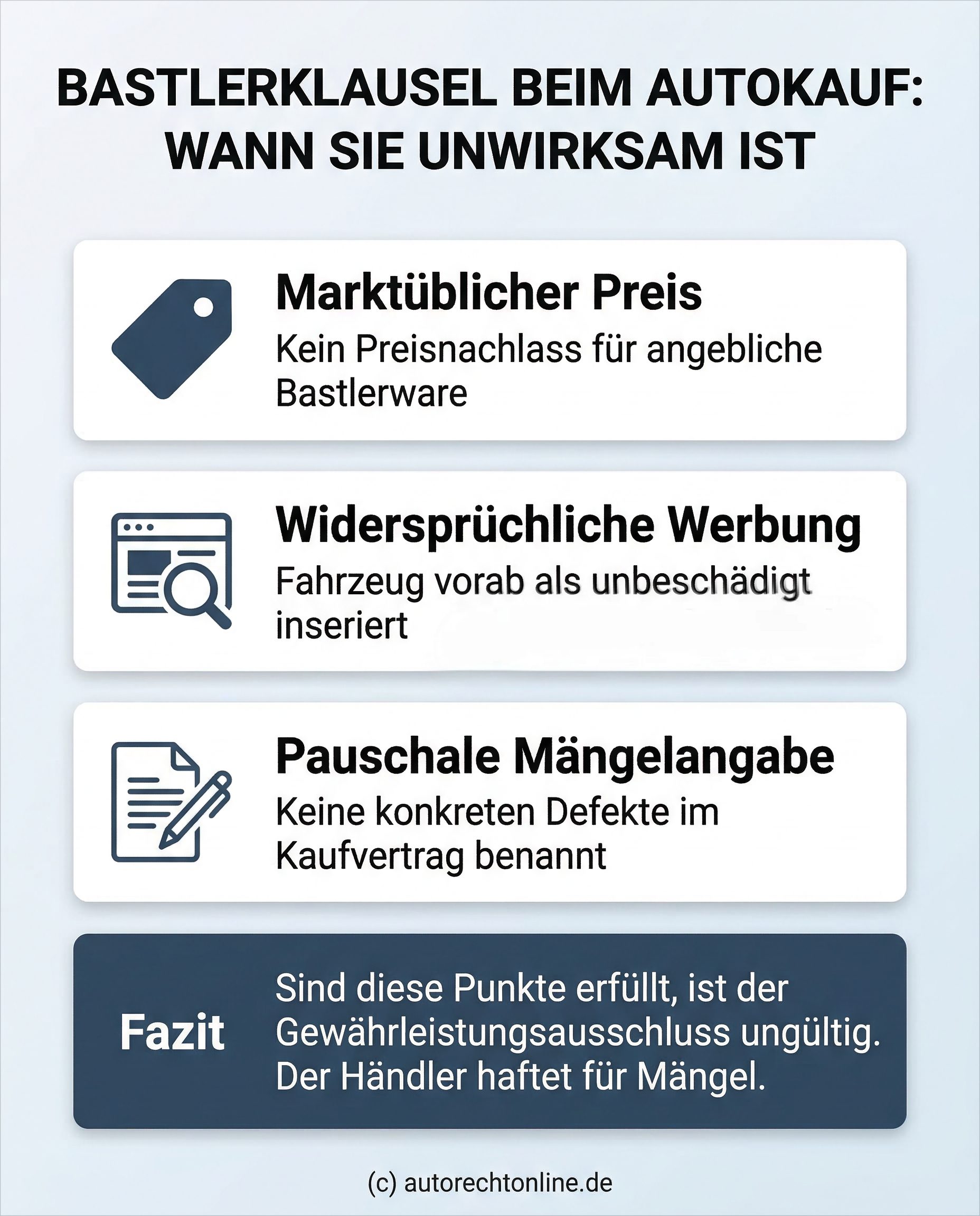 - Greift meine Gewährleistung trotz Bastlerklausel, wenn der Kaufpreis dem tatsächlichen Marktwert des Autos entsprach?